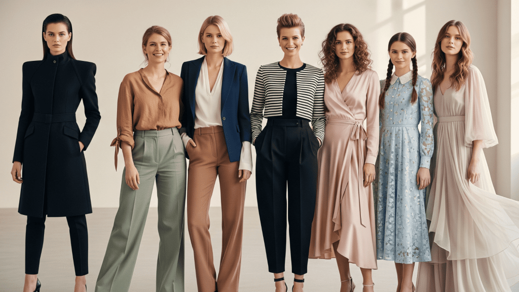 - Curved Silhouette: Clothing looks best when it follows a naturally defined waist and soft hip line, highlighting feminine proportions.